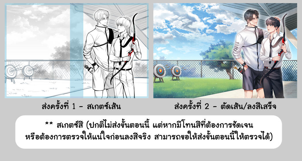 🔹 การแก้สีหน้า ท่าทางตัวละคร องค์ประกอบภาพ ขอให้ตรวจแก้ให้จบในขั้นตอนสเกตซ์เส้น เนื่องจากในส่วนของขั้นตอนตัดเส้นและลงสีเสร็จ จะแก้ไขให้ได้แค่เรื่องของสีเท่านั้น